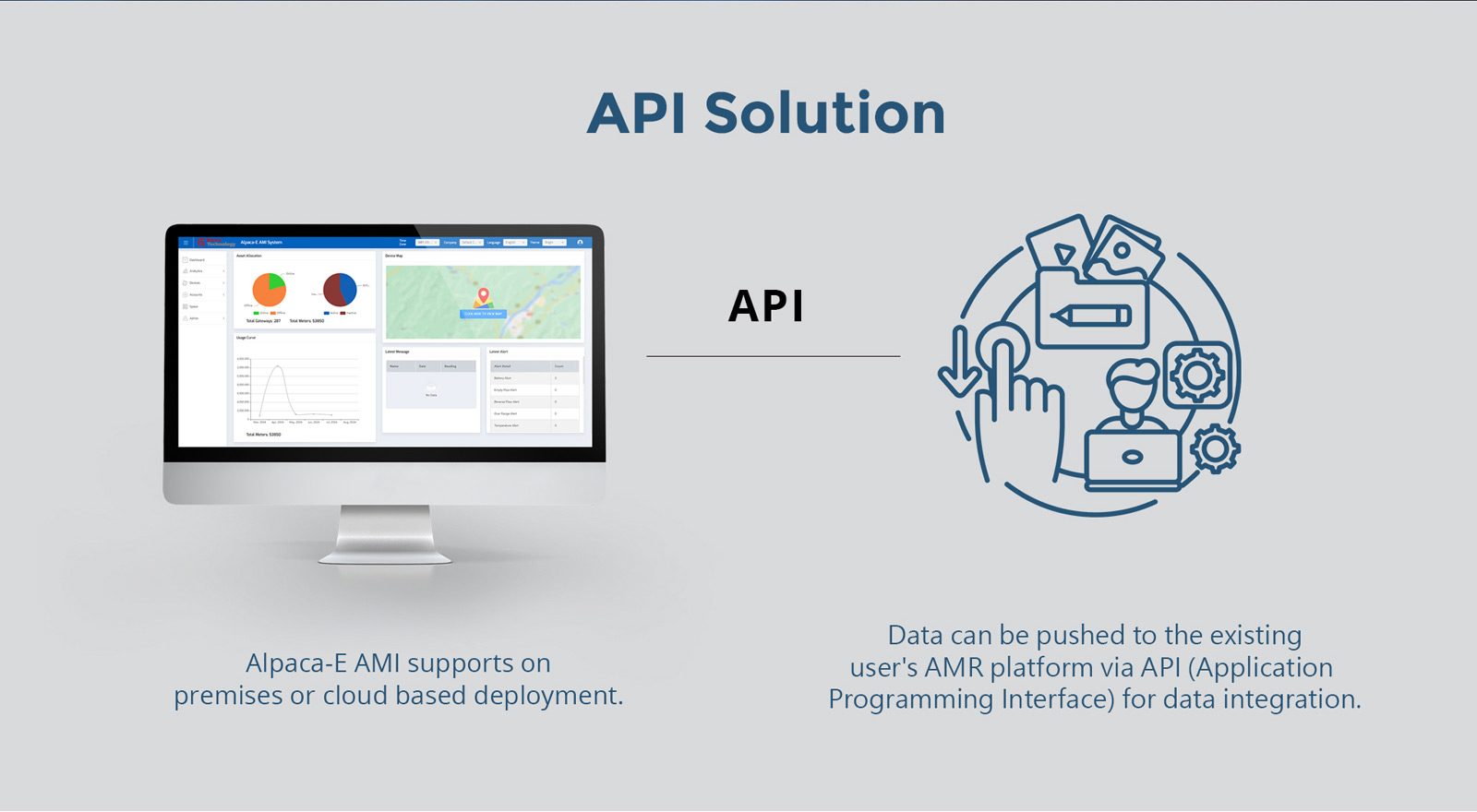 Alpaca-E AMI System is a smart metering platform for water metering scenarios, featuring core functions including meter data visualization & management, remote valve control (optional), and smart alerting (e.g., leak detection, empty pipe, low battery).