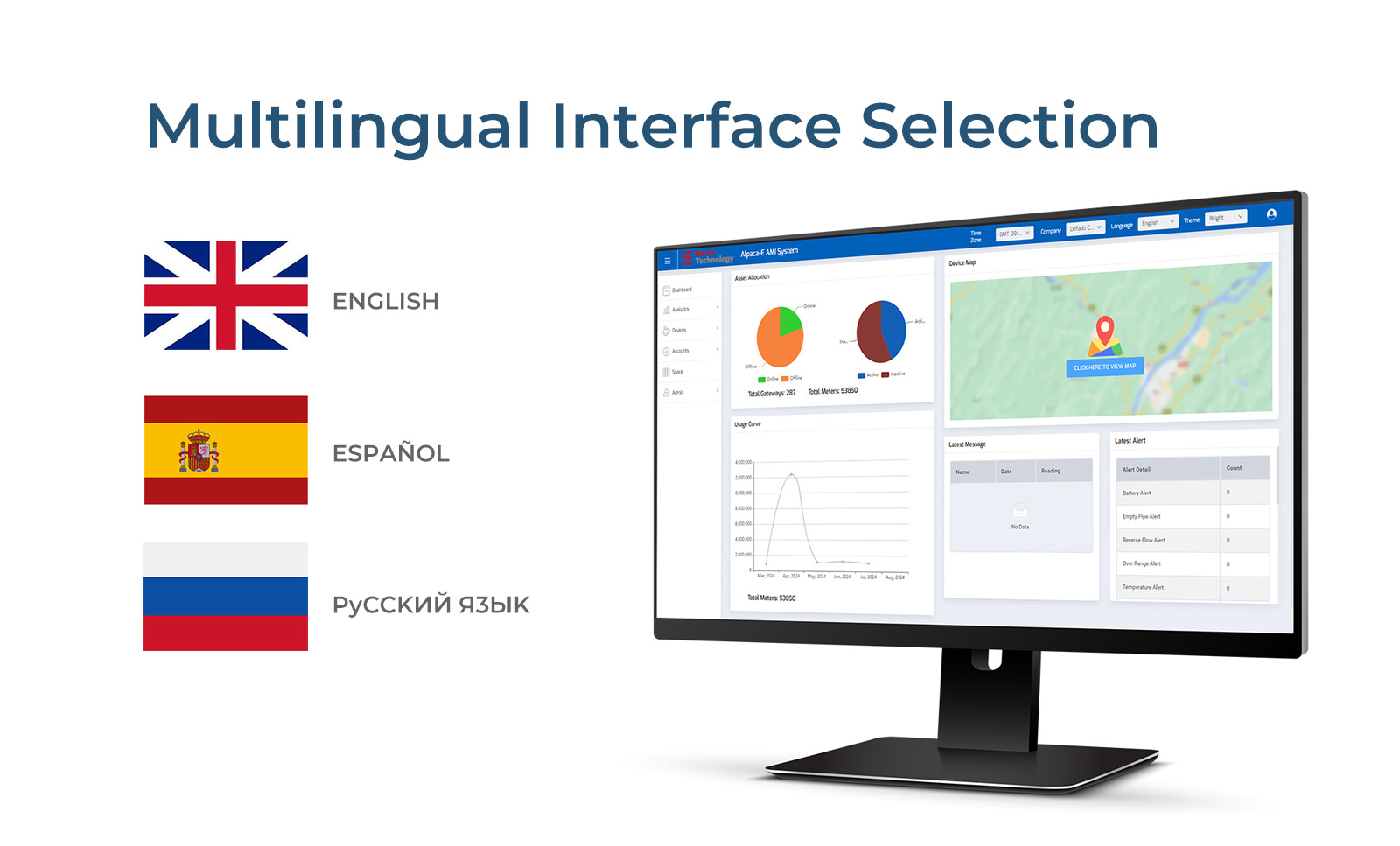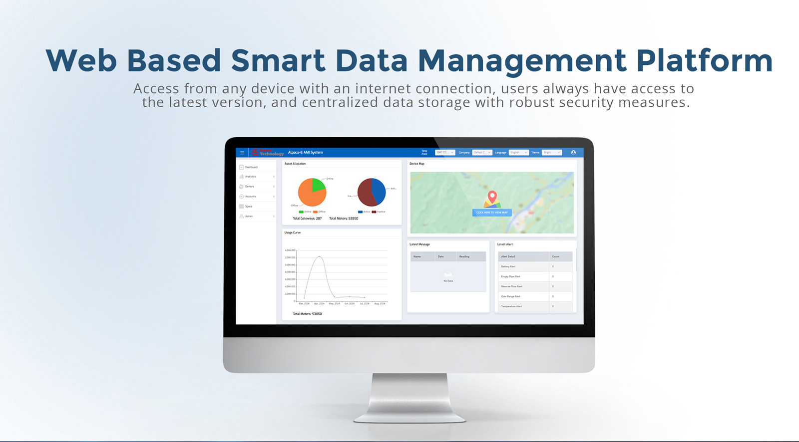 Alpaca-E AMI System is a smart metering platform for water metering scenarios, featuring core functions including meter data visualization & management, remote valve control (optional), and smart alerting (e.g., leak detection, empty pipe, low battery).